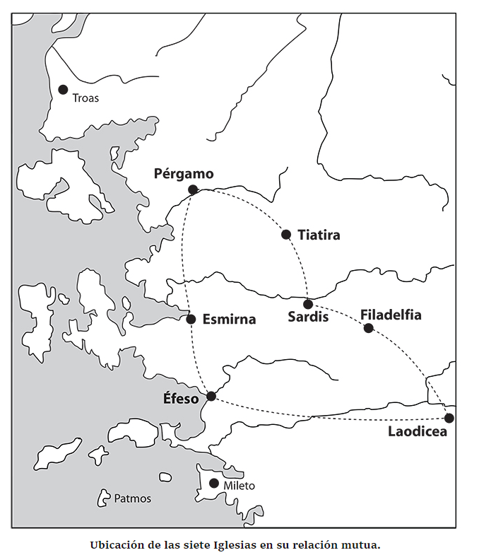 Para comenzar, las iglesias a las cuales fueron dirigidos los siete mensajes están enunciadas en cierto orden geográfico. Las ciudades donde se encontraban estas siete iglesias (cf. 1:11) estaban ubicadas sobre caminos romanos, interconectadas, a intervalos de unos 50 a 65 km (30 a 40 mi), formando así un circuito.3 Una persona que visitara estas ciudades viajaría en un semicírculo comenzando en Éfeso, la ciudad más cercana a Patmos, y avanzaría en el sentido del reloj hacia el norte a Esmirna y Pérgamo, luego hacia el sudeste hacia Tiatira, Sardis, Filadelfia y finalmente, a Laodicea. Es posible que los mensajes a las iglesias se llevaran siguiendo esta ruta. “Las cartas dirigidas a estas siete ciudades podían fácilmente circular en las áreas vecinas; y siendo que cada carta tenía que ser escrita a mano, cada carta tendría que ser enviada donde pudiera alcanzar más fácilmente al mayor número de personas”.4