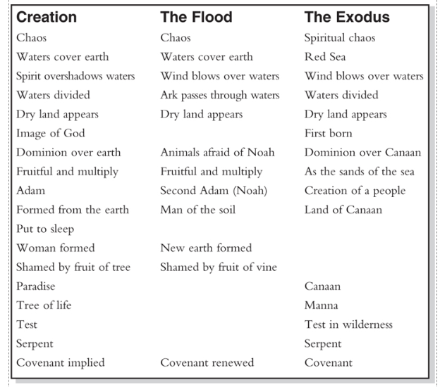 Podemos observar aún otros paralelismos. Así como tanto el Edén como el desierto tuvieron una prueba, también ambos contenían una serpiente (Gén. 3:1ss.; Núm. 21:5-9). Dios hizo pactos con el Adán original y con Noé (Gén. 1:26-30, cf. Gén. 9:1-3), y también estableció un pacto con Israel (Éx. 19, 20). Existen paralelos tras paralelos entre la obra de Dios en el relato del Éxodo y su actividad en el relato de la Creación y el Diluvio.