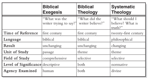 Hasta este punto, la exégesis bíblica y la teología bíblica son idénticas en su enfoque básico. Sin embargo, existen diferencias entre ellas. Al hacer teología bíblica, en lugar de estudiar pasajes, se exploran temas e ideas. Se hacen preguntas como: «¿Qué creía Juan sobre el fin del mundo?». En cuanto se abordan los temas, también se vuelve selectivo. Si se preguntara, por ejemplo, «¿Cuál era la perspectiva de Juan sobre la salvación?», se podrían considerar algunos pasajes del Apocalipsis, pero no otros. No se examinaría cada parte del libro por igual, ya que el tema es la «salvación», y los textos que no tienen nada que ver con la salvación no serían de interés en ese momento. Si se preguntara «¿Cuál era la perspectiva de Jeremías sobre la salud?», probablemente se encontraría muy poco sobre ese tema en el libro de Jeremías, porque no lo aborda. Por lo tanto, las preguntas temáticas sobre las creencias de un escritor son muy selectivas. Se selecciona solo el material que aborda la pregunta.