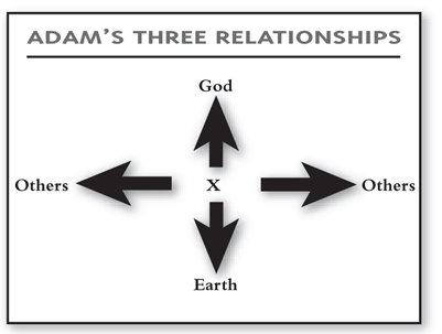 3. La imagen de Dios también incluía el dominio sobre la tierra. Adán gobernaba sobre los peces del mar, las aves del cielo y las criaturas que se desplazan por la tierra. Adán y Eva debían ser como mentores de los animales, las plantas y todo el medio ambiente. Podemos ilustrar las tres relaciones de la siguiente manera.