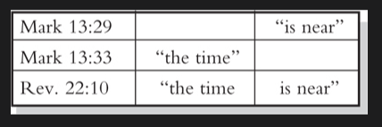 Como se ilustra en inglés en el recuadro de la página anterior, Apocalipsis 22:10 contiene un paralelo verbal exacto con Marcos 13 en griego. Pero en Marcos 13, Jesús dijo que «el tiempo» sería inminente solo después de que ciertas cosas hubieran sucedido. En otras palabras, en el año 31 d. C. (cuando Jesús habló), el tiempo no estaba cerca. Pero para la fecha en que Juan terminó el libro de Apocalipsis, las cosas habían cambiado. El tiempo ahora estaba cerca. ¿Cuál es la diferencia entre las dos declaraciones? El contraste es el «todas estas cosas» de Marcos 13:29. Las «señales» que debían tener lugar entre cuando Jesús habló y el momento en que su venida estaría cerca se habían cumplido para cuando Juan compuso el libro de Apocalipsis.