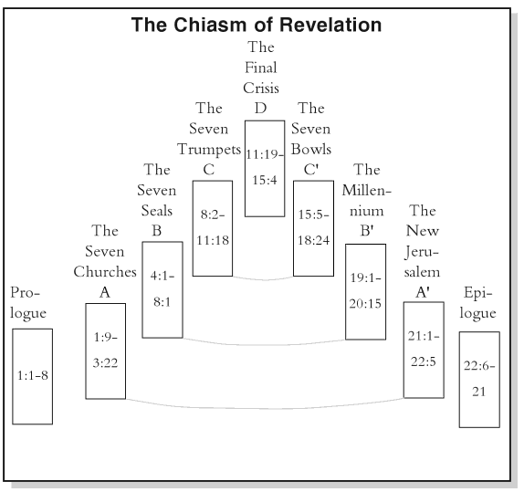 Las copas mismas presentan un sorprendente paralelismo con las siete trompetas. La principal diferencia radica en que la mayoría de las trompetas afectan a tercios de la tierra, mientras que la mayoría de las copas impactan a toda la tierra. Como vemos en el diagrama de la estructura de Apocalipsis a continuación, las siete copas siguen las escenas de crisis final de Apocalipsis 12-14, pero también presentan un paralelismo con las trompetas. Al igual que en las demás visiones de Apocalipsis, las siete plagas de las copas comienzan con una introducción al santuario (véase el capítulo 6 del volumen introductorio de esta serie: Las cosas profundas de Dios ) .