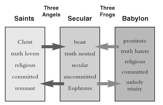 Hay, por lo tanto, dos «trinidades» y dos grupos de mensajeros (tres ángeles y tres ranas) que salen al mundo durante la batalla final. Hay mucho en juego, como nunca antes. En la medida en que los tres ángeles de Dios (versículos 6-12) lleguen al mundo, las fuerzas del mal lo tendrán difícil. Por otro lado, si la trinidad demoníaca logra unir a todas las naciones de la tierra bajo su liderazgo, la lucha final de los santos será aún más difícil. Cuando los poderes civiles y seculares del mundo presten su poder a la trinidad demoníaca, el escenario estará listo para la batalla final.
