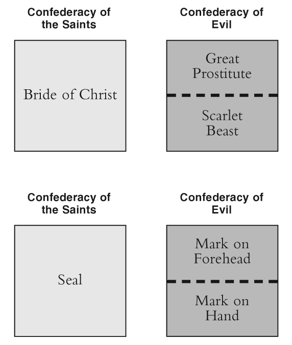 En Apocalipsis, una confederación política mundial opera en nombre de una confederación religiosa global. Pero en algún momento de la historia, la confederación política cambia de opinión y se vuelve contra la confederación religiosa, destruyéndola. Juan ve todo esto desde una perspectiva global.